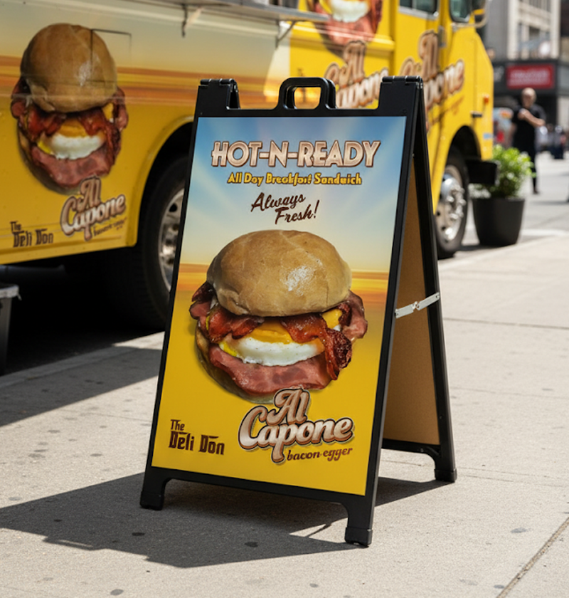 Fast-casual restaurant concept emphasizing menu imagery and franchise leads.